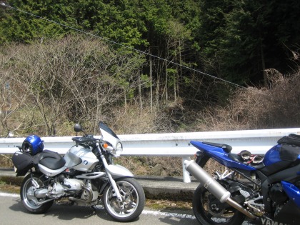 1138 中間地点で休憩 林道の中間地点まできて、ちょっと休憩。 この林道は全長約40kmほどあり、低速コーナーが連続するため、疲れてしまうので途中でちょっと休憩をします。 今回、ドイツ製耕運機愛好家さんは初めてこの林道を走りましたが、自分のR1にピッタリとついてきます。 自分としても、そこそこのペースで走っているつもりですが、公称85PSしかないBMW R1150Rの速さにビックリ。 と言うより、ドイツ製耕運機愛好家さんが速いのね。 |