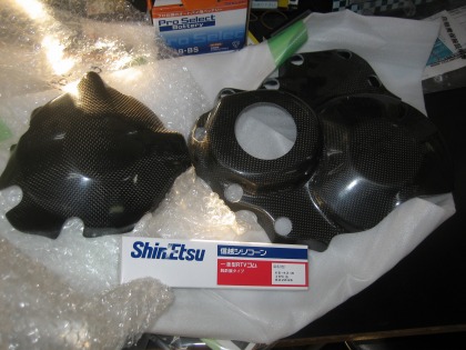 16:46 エンジン2次カバー 筑波の練習の帰り、マシンの整備をかねてK2Yに行ってきました。 まずは、注文しておいたエンジン二次カバーが入荷しました。 ウォルターウルフ製。 定価でクラッチ側、\21,000、ジェネレータ側\12,000です。 高い! (-_-;) もともと、ノーマルのケースのダイキャストが薄すぎ! 軽量化のためか知りませんけど、厚さが4mmくらいしかないので、転倒するとまず壊れて、簡単にオイル漏れが起こります。 そのためのカバーらしいんですが、本末転倒の様に感じます。 それでも、たぶん転倒一発でダメになるんでしょうね。 接着剤でケースに直接貼り付けるので、一度付けたら取れそうもありません。 と言うことは、転倒してカバーがダメになったら、カバーとケースの両方を交換しなくちゃならないハメに? なので、とりあえず練習の時は未装着、レギュレーションで装着しないとレースには出場出来ないので、レース直前に取り付ける予定。 |