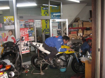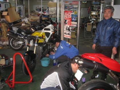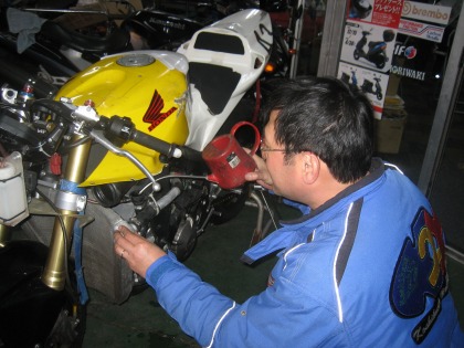 17:45 とりあえず跨る ラジエータ液が抜ききれるまで、少し置いておきます。 で、待っている間退屈なので、とりあえず跨って、今日の練習をイメージしながら、伏せてみる。 |