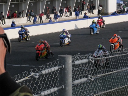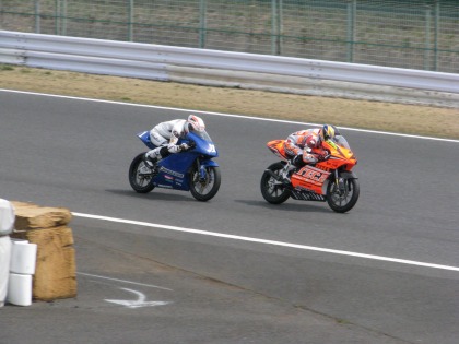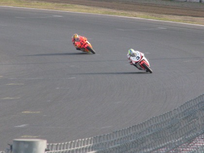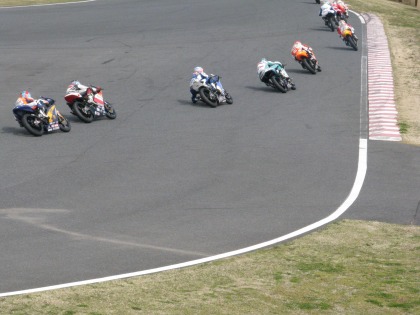 11:20 数珠繋ぎ GP125クラスのレースは白熱しています。 マシンの差が拮抗(拮抗)しているので、ご覧のように数珠つなぎ。 各所で抜きつ抜かれつのレースが見られます。 |