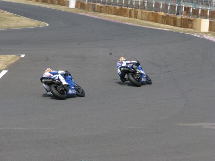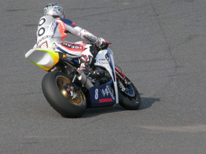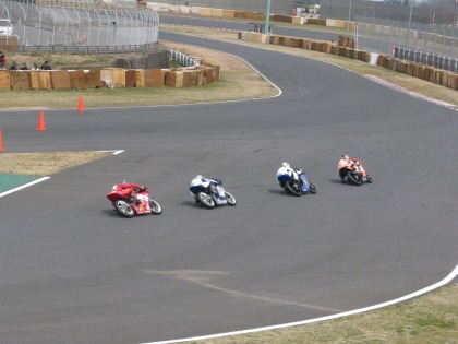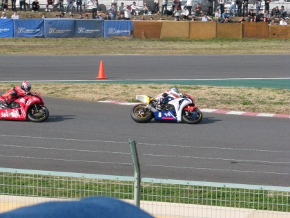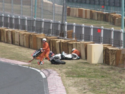 11:28 転倒 MCコーナーの立ち上がりで、マシンが振られて1台転倒、それをよけきれずに、もう1台も転倒しました。 MCコーナーの立ち上がりは2ヘアピンまで2→3→4速と加速していく区間です。 MCコーナーから2ヘアピンまで、加速区間としては結構な長さがあります。ここでの加速の善し悪しが、タイムにとても影響します。 このため、MCコーナーを左に切り返して、フルバンク状態からの加速を要求されるので、ちょっとミスをすると転倒しちゃうわけです。 |