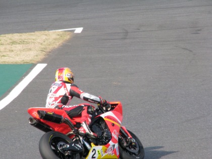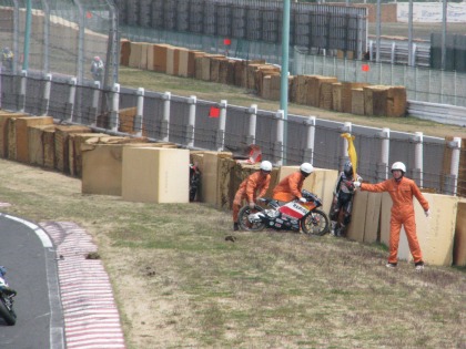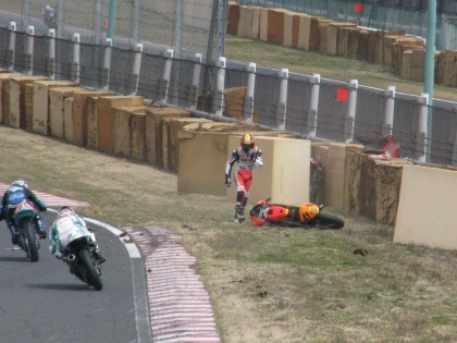 11:43 またまた転倒 このレースMCコーナーで3回目の転倒です。 バイクレースに転倒はつきものですが、最初の1台2台であれば、ライダーの真剣さが伝わってきますが、あまりに転倒が多いと、「やりすぎだろう」と醒めてくる部分がありますね。 怪我はしないでほしいものです。 |