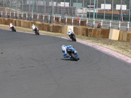 11:20 GP125 JGP125のレースが始まりました。 1周目、トップでやってきたのは、ゼッケン1番、ベテランの菊池選手。 GP125クラスは激戦で、全日本も地方選手権も、抜きつ抜かれつのレースが見られ、エキサイティングです。 |