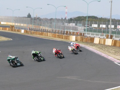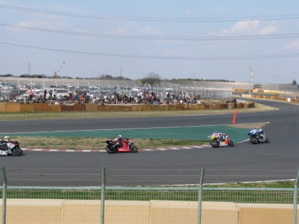 14:18 JSBクラス決勝 JSBクラスのレースが始まりました。 と、思ったら、1周目の1ヘアピンで多重クラッシュ。 赤旗中断です。 この時点で、去年のチャンプ中須賀選手と優勝候補の一人、ヨシムラの酒井選手がリタイヤしました。 と言うことで、ウォーミングアップで写真を撮っていたので、載せておきました。 |