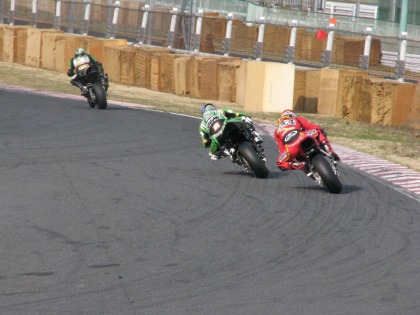 15:37 表彰台争い 先頭は桜井ホンダの亀谷長純選手 2番手、SP忠夫の大崎選手 3番手争いは、写真のカワサキの柳川選手と昨年GP250クラスのチャンピオンで今年JSBに移った高橋巧の争いです。 高橋選手は、柳川選手の後方に付きピッタリとマークするも、ベテランの柳川選手はそう簡単には前に出させてくれません。 |