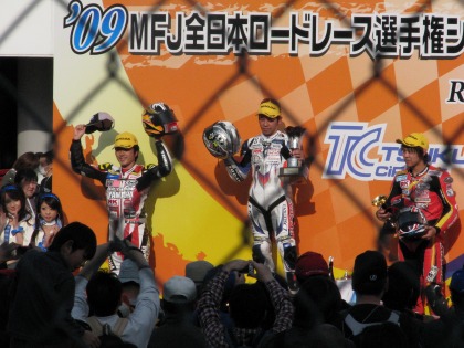 16:00 3位は 最後まで表彰台争いをしていた、柳川選手と高橋巧選手は、最終周、最終コーナー立ち上がりで高橋選手が前に出て3位をゲット。 JSB初レースで表彰台をゲットしました。 1位、桜井ホンダの亀谷長純選手 2位、SP忠夫レーシングの大崎選手 3位 バーニングブラッドの高橋巧選手。 でした。 |