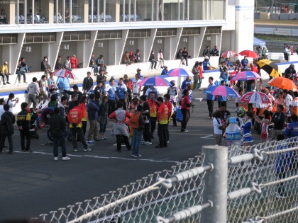 11:01 MCコーナーで観戦 決勝を前に、観戦ポイントを移動します。 1ヘアピンをのぞいたんですが、満員御礼状態。 最近お気に入りの、MCコーナーのスタンドで観戦することにしました。 MCコーナーのスタンドも満員状態。 席に座ることが出来ず、階段に立っての観戦です。 どこかで見かけたような姿が・・・・ 分かる人には分かるが、分からない人には分からない。当たり前のこと。 |