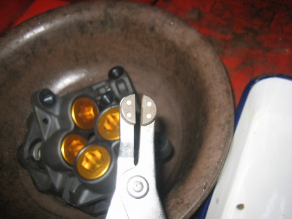18:36 割れた太陽の塔 作業はブレーキキャリパーに戻って。 取り出した”頭を割られた太陽の塔”みたいな特殊工具はブレーキのピストンをキャリパーから取り外す工具。 頭の丸い部分をピストンの内側に入れて、押し広げ、ピストンを引き抜きます。 これが無いと、ピストンを取り出すのは結構面倒。 でも、R1の小さい方のブレーキピストンはこの工具より小さかった。 なので、大きいのはこの工具を使って、小さいのは”企業秘密”、じゃなくて、エアーで押し出しました。 |
