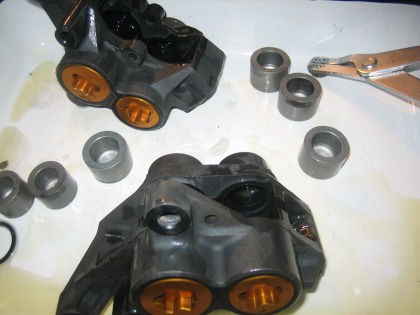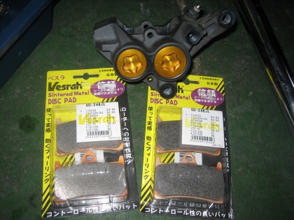 21:19 光ってます キャリパーにパッドを装着した後、フロントフォークに取り付けます。 さすが、新品パッドが輝いてますね。 (金のペイントはちょっと下品に見えなくはないけど・・・) |