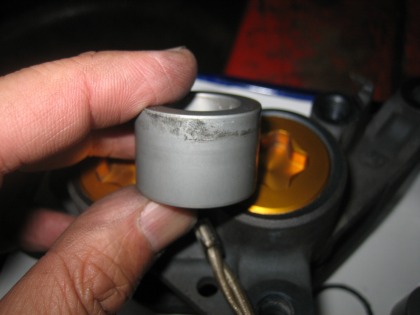 19:12 ピストンの汚れ ピストンのサイドに付着したブレーキダスト。 R1の年式は'03だから、約6年くらいはちゃんとバラして清掃はしてないでしょう。 結構カッチリ付着してます。 これを、ブレーキクリーナーとウエスを使って、きれいにします。 |