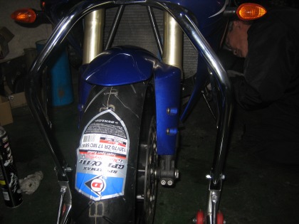 21:11 フロントも新品 フロントは3分山程度残っていましたが、リヤをBSからDUNLOPに変更するので、フロントも交換。 当然フロントもα11。 今月はCBR600とR1の両方ともタイヤを交換なので、財布がかなりイタイ。(>_<) |