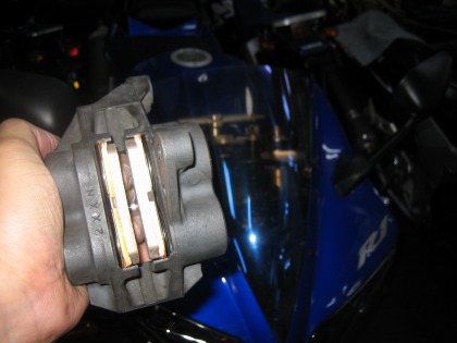 20:56 古いパッド 装着してあった古いパッド。 残りが2mmを切ったくらい。 もともと、前のオーナーが距離を乗っていなかったので (2003年〜2008年の6年で7,000キロ)、ブレーキパッドもたぶん1枚目?。 ベースプレートに錆が浮いています。 |