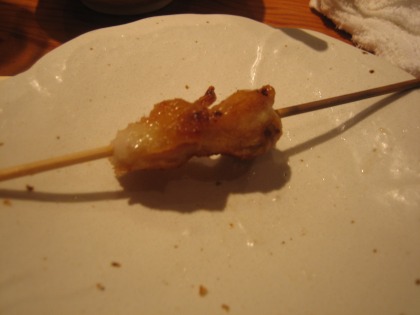 20:03 ぼんじり 追加で、”ぼんじり”。 これも、脂がのっていますが、さらっとしていて、嫌な臭みがなく、美味しい。 いつものように、写真を撮る前にフライング。 2切れほど食べちゃいました。(爆) |