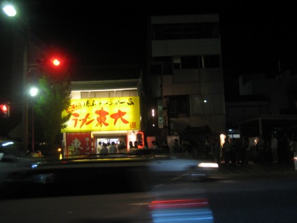 20:55 並んでる 焼とり屋を出た後、男レーシングさんはホテルへ。 夜のネオンが好きな自分は、繁華街をプラプラと散策。 ラーメン屋の前に行列が出来ていました。 徳島にもご当地ラーメン、”徳島ラーメン”があるんですね。これも知りませんでした。 四国に来なければ知らなかったことが、色々とありますね。 自分としては行列に並んでまで、食べるものではないと思ってます。 |
