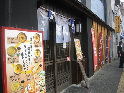 7:33 うどん屋に到着 ナビの到着予定時刻通り(上の写真の左下)に、うどん屋に到着しました。 (携帯ナビには徒歩モードがある) お店の名前は、”セルフうどん やま 幸町店”。 朝7時から開店していて年中無休、旅人にはありがたいお店です。 さっそく入ってみます。 |