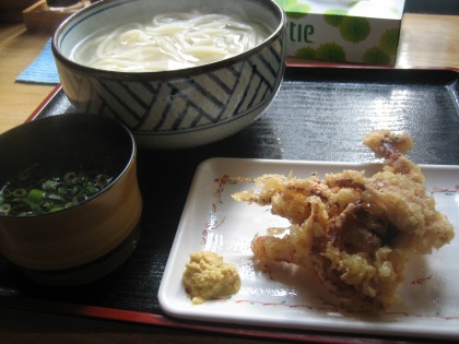7:37 釜揚げうどん 注文は、”釜揚げうどん(中)(¥340)”と”げそ天(¥100)”。 中盛りは、うどん2玉で、結構量があります。 小盛りが、標準でうどん1玉でした。 ご存じかもしれませんが、釜揚げは、お湯に浸された状態で麺が出てきます。 それに、暖かい付け汁を付けて食べます。 それでは、早速いただきます。 さぬきうどん特有の腰があって、つるつるシコシコ美味しいです。 出汁は”いりこ”が効いていて甘みがあり、うどんに合っています。 薬味におろしショウガを少し入れると、味が引き締まって美味しさアップですね。 |