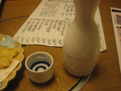 20:24 続いて 続いて、香川県のお酒”川鶴”あらばしり無濾過生。 冷や酒でいただきます。 小さい方(一合)で頼んだつもりが、大きいの(二号徳利)ででてきました。 サービスかな? (そんなことはなく、ちゃんと2合分取られてました) 味? 覚えてません。(-_-) きっと、美味しかったんでしょう。 |