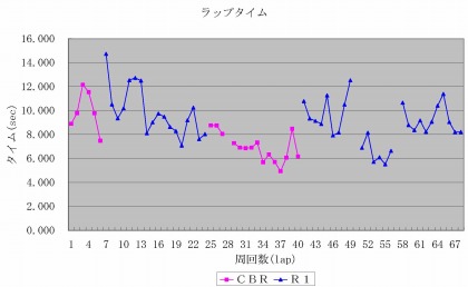 本日の走行 ピンクがCBRで青がR1 最初、CBRで6ラップ 次に、R1で19ラップ 午後になって、CBRですぐにチェッカーで3ラップのみ その後、12ラップ その後はR1に戻って9ラップ、6ラップ、11ラップ 結局、CBRで21ラップ、R1で45ラップのトータル66ラップでした。 CBRでのベストは何とか4秒台の1分4秒935 R1は1分5秒515 ハルナさんのベストが1分4秒961と100分の3秒違いと、完全にドングリの背比べ状態。 決着は、筑波戦に持ち越されたのであった。 |
