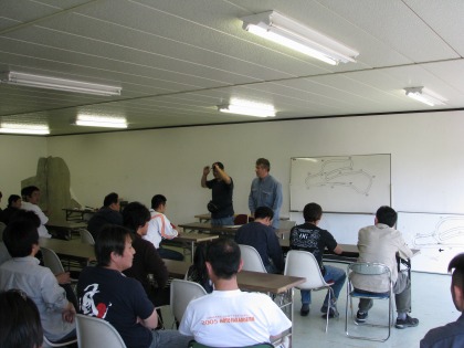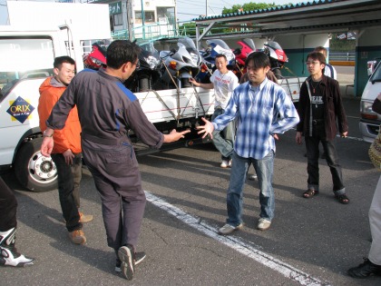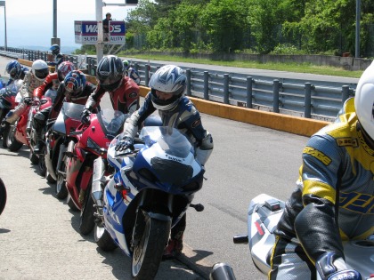 8:30 初めての人 『今日、サーキット走行初めての人、手を上げて』 何名かいるみたいですね。 一番最初にコースイン・コースアウトの練習をするために初心者の人は慣熟走行をすることになりました。 |