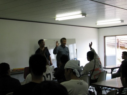 8:28 ライダーズミーティング 今日の走行会は参加者が40名ほど。 サーキット初心者も何名かいるようなので、走り方やコースイン。コースアウトの簡単な説明を兼ねてライダーズミーティングをします。 左が今回の走行会を主催したムラコシさん。 右はご存じのアイスエイジさん。 |