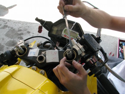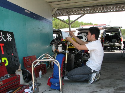 11:19 オパミン準備 フロントフォークスプリングの交換が終わり、オパミンが乗ります。 オートバイに乗るのは、なんと去年夏の筑波戦以来、約10カ月ぶりになります。 |