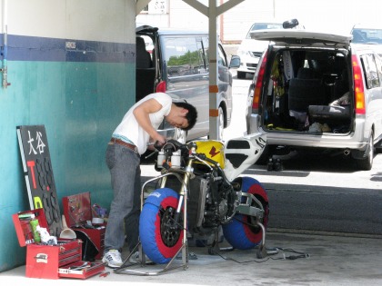 8:40 準備続行 ライダースミーティングが終わりました。 各自、走行の準備のため、ピットに戻ります。 カメラを向けられたハルナさんは、ムンクの”叫び”の様な顔をしていますけど、今ひとつ写真が小さくてわかりませんよ。 |