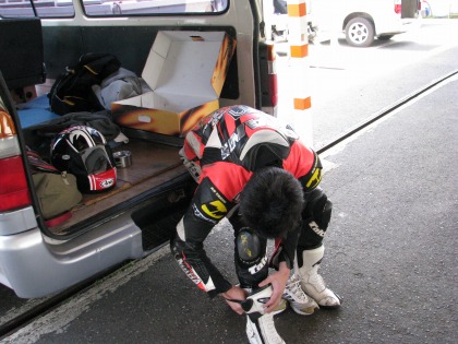 8:56 おニューです アイスエイジさんは今回、レーシングスーツを新調。 ステージレザー製です。 自分も新しいレーシングスーツ欲しいなぁ。 |