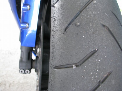 15:47 R1終了後 R1の終了後のタイヤ リヤは一応端っこまで使ったみたいですね。 フロントは全部使い切れるかなぁ。 タイヤはα11ですが、ストリートタイヤですので、CBRに履いているレーシングタイヤに比べるとグリップ力は期待できません。当然ですがグリップ感も少ないですね。 逆に久しぶりにニュータイヤを履いたCBRは思い切りグリップ感を感じました。 さすが、ニュータイヤ、滑る気がしない。 次回、6月のレースは当然ニュータイヤ。 1年半、ユーズドははき続け、ニュータイヤで勝負。 まるで、大リーグボール養成ギブスを付け続けた星飛馬がギブスを外したときの様に飛躍出来るか。それは疑問だ。 今回、CBR600RRとYZF−R1(1,000cc)を持ち込んで、交互に乗っていました。 バイクに乗るのは速くなりませんが、器用にはなったみたいで、パッと乗り換えてもそこそこ走れる様になりました。。 タイヤもBSとDUNLOPとそれぞれ異なるのに、違いを感じつつまあそこそこ乗れました。 追記として) 今回R1を初めてサーキットに持ち込みました。 前回交換したベスラーのブレーキパッドですが、ストリート用なので、サーキットで使った場合、思った以上に効きませんでした。 このブレーキパッド、握り込んで行っても効きません。 かなり固い感じです。 そのため、思いっきり握ってやっても、制動力がリニアに立ち上がっていってくれない感じです。 03R1に限った話かもしれませんが、サーキット走行をする人は、サーキット用のパッドが出ているので、それがよろしいかと思います。 |