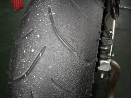 15:38 走行後フロントタイヤ 筑波の練習の帰り、マシン整備のため、いつものようにK2Yに寄りました。 サーキットでは、午後から四輪車の走行があるというので、早々にマシンをトランスポーターに積み込んでピットを明け渡しました。 そんなんで、使用後の写真をK2Yに来てから撮影。 上の写真はフロントBT003 TYPEV(Midium)。 エビスの走行会で新品を下ろして、約88周(176km) 今日の筑波で、8周(16km)の合計約192km。 次回、レース前日の練習走行で使用して終わり。ですね。 下の写真はリヤBT002pro TYPEU(Hard-Midium) こっちも、使用履歴はフロントタイヤと同じ。 今日の練習では、溶け出す前に走行が終わりました。 |