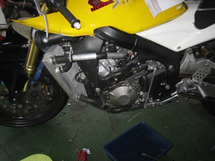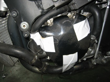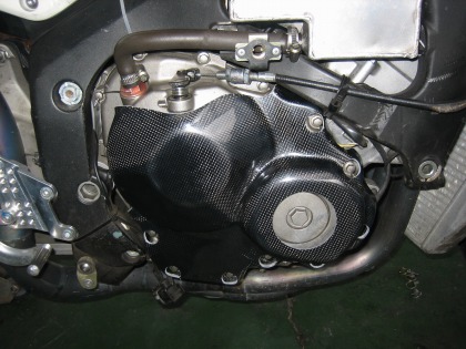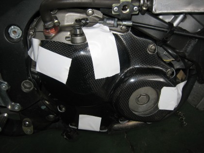 16:25 エンジン2次カバー取付 今日は来週のレースのために、エンジン2次カバーの取付をします。 MFJのST600のレギュレーションでは、転倒時に地面に接触する恐れのあるオイルを保持する全てのエンジンケース、カバーは複合素材(カーボンまたはケプラー製)の2次カバーによって保護されなければならない。とあります。 要するに、これを付けないと車検に通らないと言うことですね。 まずは、カウルを外して、取付面をパーツクリーナーできれいに清掃。 |