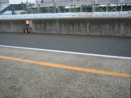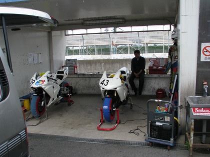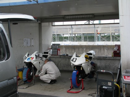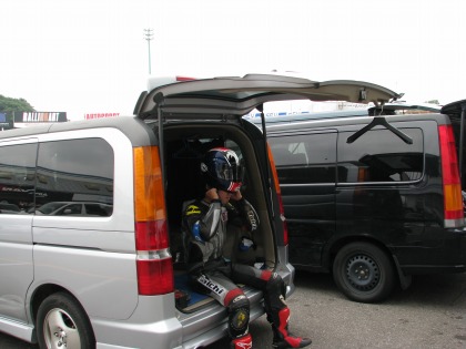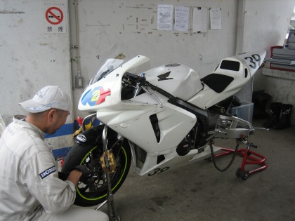 9:13 準備完了 タイヤのエアー圧のチェック、ガソリン給油などを済ませ、タイヤウォーマーを巻いて準備ができました。 走行までには、まだ時間があります。 天気が不安定で明日の天気の予想ができません。 そのため、予選とレースが晴れている時、雨が降っている時の段取りを確認。 色々なシミュレーションをしておきます。 そして、時間が空いている間に、ブリヂストンのタイヤサービスに顔を出して、練習後に新品のタイヤに交換することを確認。 |