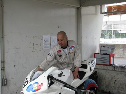 9:45 去年までオパミンが所属していた忠夫レーシングからST600にエントリーしている佐藤さん。 ST600のスポーツ走行が始まるので、走行の準備を始めます。 |