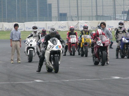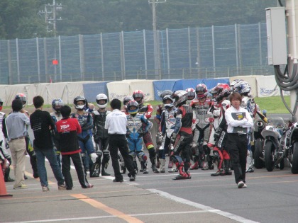 12:06 スタート練習 12時からは、希望者を対象にスタート練習があります。 普段の練習走行のときはホームストレートのグリッドに停止して、スタートの練習なんてできませんから、レース前は特別に時間を取ってくれます。 スタート練習前に参加者はミーティング。 写真の右端にいるスタッフはだれかと思ったら、今年全日本にGP125とGP250にダブルエントリーしている宇井陽一選手でした。 今日は筑波戦のアドバイザー。 |