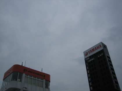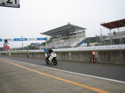 14:42 雨が! 午前中曇っていた空が暗くなってきました。 2本目走行の直前、ポツリポツリと雨が落ちてきてフロントグラスを濡らします。 今年2月にCBRを乗り始めたハルナさん、雨の中走ったことがありません。 『オーマイ、ガァ!』 |
