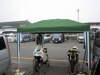 9:01 ピットを移動、マシンを準備 S字の裏にテントを貼っていたところ、知り合いが確保したピットを譲ってくれるというので、ピットが使えるならば、と言うことでテントから移動してきました。 ハルナさんと2台、マシンを移動し、走行の準備を始めます。 明日のTC600の車検は7時から、近隣への騒音対策として暖気は7時20分から、そして予選は8時からです。 そのため、タイヤウォーマーが使用できるのは暖気後の35分ほどです。 今、実際に40分ほどタイヤウォーマーで温めてみました。 タイヤのセンターはそこそこ暖かくなりましたが、サイド部分は少しだけ、ホイールに関してはまったく暖まっていませんでした。 このため、タイヤが十分に暖まっていないとグリップを発揮しないBSのタイヤは注意が必要ですね。 |