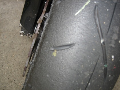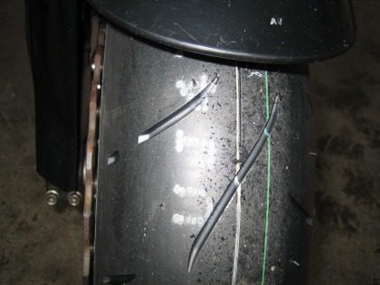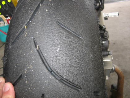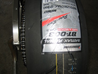 17:10 タイヤ交換終了 レースの受付を済ませたり、荷物をガレージに移動したりする作業が一段落した時点で、ちょうどタイヤの交換も終わっていました。 ここで、CBRにドライとウェットのどっちのタイヤを装着するか軽く迷います。 自分の予想では、予選はウェット。 でも、ウェットコンディションを走ったことがないハルナさんは、ドライコンディションを願って、”てるてる坊主”代わりにドライタイヤを装着。 タイムで負けている自分としては、先週の練習が雨だったこともあり、”雨の方が有利”と言うことで、願いを込めてレインタイヤを装着したいところですが、レース初出場の人間を相手に大人げないので、とりあえずドライをセットします。 あと、自分はディスクローターを1セットしか持ってなく、ローターはドライのホイルにセットしてあるので、付け替えるのが面倒くさいと言うのがホンネ? タイヤは念願のと言うより、やっと今年の公認タイヤBT003です。 コンパウンドはフロントがType3でミディアム、 リヤがType2のハード−ミディアムです。 空気圧は前後とも1.9キロ レインタイヤはフロントの形式がME01Z、リヤがE06Zです。 今回、5月20日から新しいウェットタイヤ(フロントE05Z、リヤE08Z)が発売され公認になりましたが、数が少なくTC600まで回ってきませんでした。(ちょっと残念) ウェットタイヤの空気圧について、BSのタイヤサービスに聞くとタイヤの空気圧は2.0〜2.2キロ。 雨が多ければ多いほど、タイヤのエアー圧は高めに設定するそうです。 理由は、水量が増えたときは、より空気圧を上げて、溝をつぶさないようにするためらしい。 |