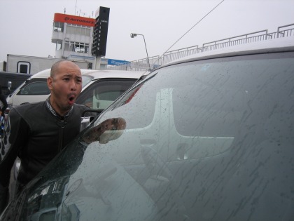 14:07 やっちゃいました part2 スタート練習も終わり、昼食を食べに行って戻ると、ハルナさんが、また、やっちゃいました! 写真はハルナさんのステップワゴンの運転席。 鍵穴の上のボックスに、車のキーが! そして、車はロックされている・・・・! キーの閉じ込め、やっちゃいましたぁ! レースを目前に、落ち着いているようだが、かなり浮き足立っている。 道具はすべて外に出してあるので、2本目の練習走行には支障はありません。 速攻で電話をしてロードサービスを呼びます。 |