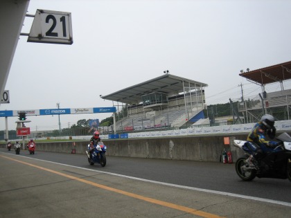 14:44 スポーツ走行2本目 スポーツ走行の2本目が始まりました。 って、ピットロードで悠長に写真を撮っている自分は雨が止むのを待っています。 雨の降り始め、ドライのタイヤで走るとすごく滑るのよ。 (って、記憶ないんですけど、転びました) 雨が降り始めたので、コースに出て行ったマシンも5〜6台。とかなり少なめ。 |
