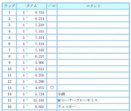14:49 雨は止まず 2本目の練習走行は、雨は止まず。 路面はだんだん濡れていきます。 コースインしたハルナさんも2〜3周して、怖いと言って戻ってきました。 結局最後まで雨は止まず、自分はピットで待機。 最終的には、少し水しぶきが上がる程度になり、最後まで走っていたのは3台くらいでした。 |