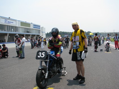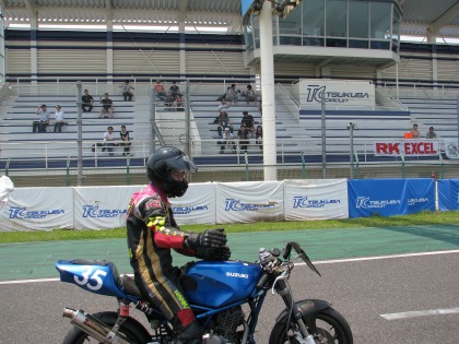 12:34 くやしそう ピットに戻ってきた入江選手、マシントラブルで1つ順位を落としたのが悔しそう。 決勝は10秒台を狙って行きましたが、ベストは11秒の真ん中あたり。 前の1番2番は別格として、3番手の予選10秒台のSR500をターゲットにしていたようです。 入江選手は久しぶりのレース出場だった様で、練習不足の様です。(実力はこんなもんじゃないらしい) 次回の9月のツーリスト・トロフィーも参戦する予定とのこと。 時間を作って、また応援に来よう! NMの決勝に進む |
