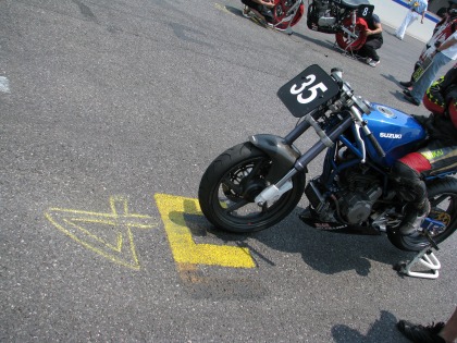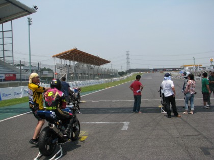 12:08 グリッドに 前のクラスのレースが終わり、NS1クラスのコースインです。 ピットロードからコースインかと思い、ピット前でタイヤウォーマーを準備して待っていたら、そのままマシンを押して各自のグリッドに。 筑波選手権の時はピットロードに並び、その後コースインして1周のサイティングラップを行い、グリッドに着くんですが、ツーリストトロフィーは違いました。 タイヤウォーマーを持ってピットロードにたたずむ自分一人。(汗) |
