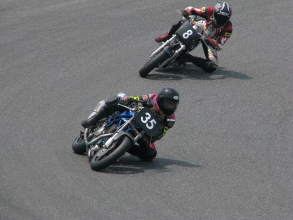 12:20 途中1回 入江選手、逃げますが1度ゼッケン8番のSR500に抜かれます。 ゼッケン8番のSR500の選手は最終コーナーの入口が得意な様で、ここで大幅に差を縮められてしまいます。 入江選手のGOOSE350では、最終コーナーはほぼノーブレーキ。 やはり、バックストレッチのスピードの乗りで負けてしまいますが、インフィールドでは完全に勝っています。 |