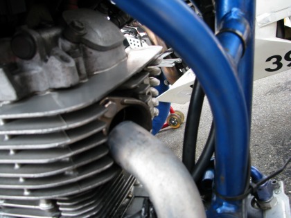 12:34 マフラー外れてますが・・・(汗) パドックに戻り、マフラーをチェックすると、エンジンとの取付部分のフランジがスッポリ外れているではないですか! これじゃ、マフラーなしと同じ。 よく走れたねぇ。 インジェクション車じゃなくてキャブ車なのに。 |
