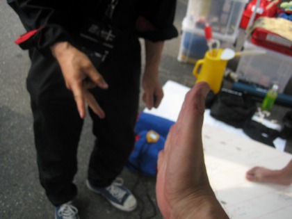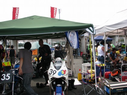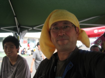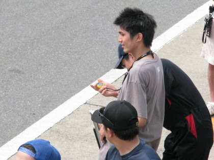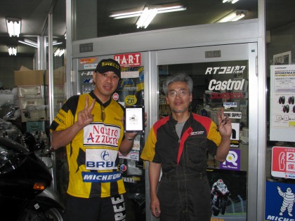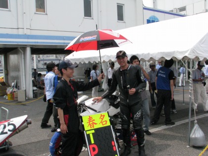 14:30 ピットクルー冥利 ピットクルーも嬉しそう。 紹介が遅れましたが、ストップウォッチを持っているのは、今日ヘルパーにきてくれた”永野くん”。 入江くんのお友達です。 自分がヘルパーをしているライダーが優勝すること。それがヘルパー冥利(みょうり)につきますね。 |