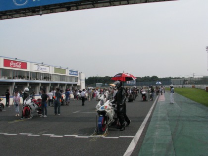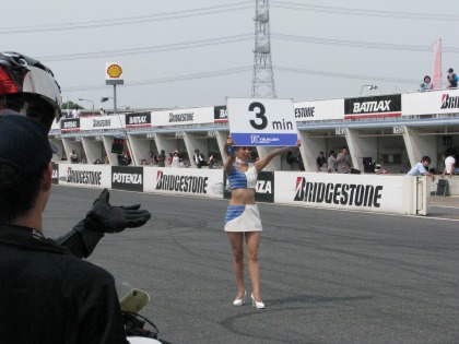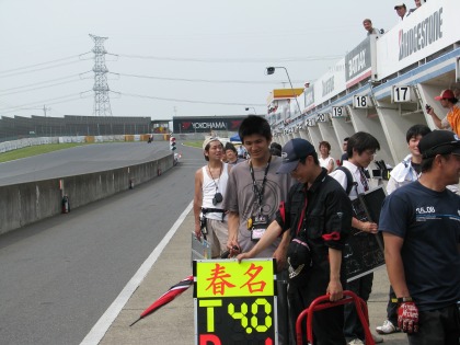 14:04 まずはパドックに スタート前チェックを済ませて、パドックにマシンを並べます。 (予選1番手だったのを見せたくて、ここでは使わないサインボードを持ってきている?) |