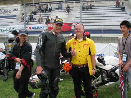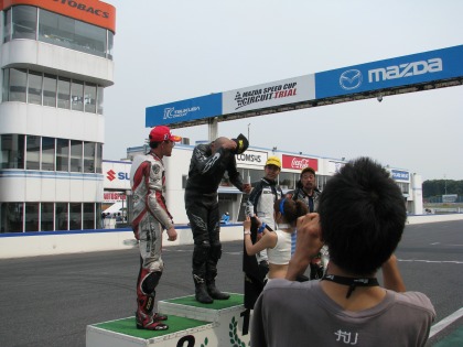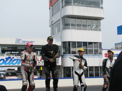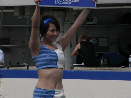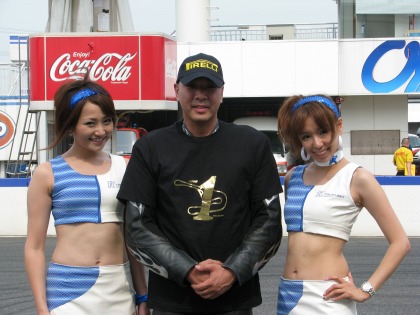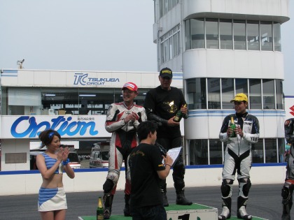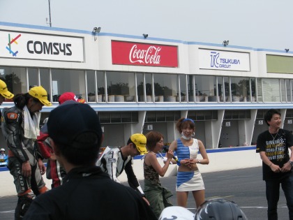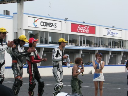 14:34 チャンピオンTシャツ 1位の選手には筑波サーキット特製のチャンピンTシャツがもらえます。 レースクィーンの姉さんが、Tシャツを着せてくれます。 (すんごい、ウラヤマシイ。自分は奥さんにさえ服を着せてもらったことがありません。(泣)) |