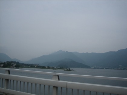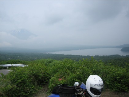 9:29 河口湖大橋から 朝食を食べた後、国道139号線を折れて、河口湖大橋を通過します。 天気が良ければ、河口湖大橋から富士山を望むことができますが、今日はダメ。 逆に曇っていて、気温が上がらず、この時期としては涼しく快適なツーリングです。 |