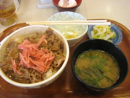 9:11 朝食 いつものパターンで、自宅で朝食を食べずにツーリングに出発。 山中湖から国道138号線を西走し河口湖近くまできて、ちょっと遅めの朝食を食べます。 朝食は”すき屋”の牛丼。 玉子と味噌汁セット、漬け物付き、¥430 |