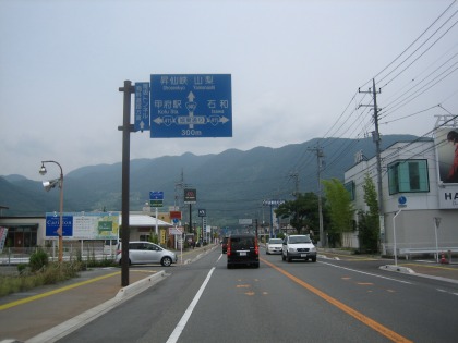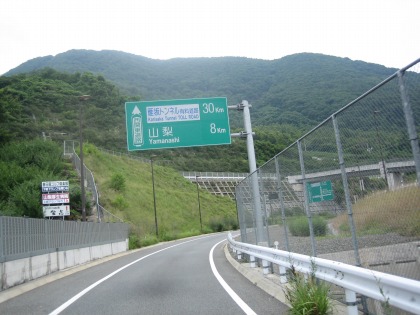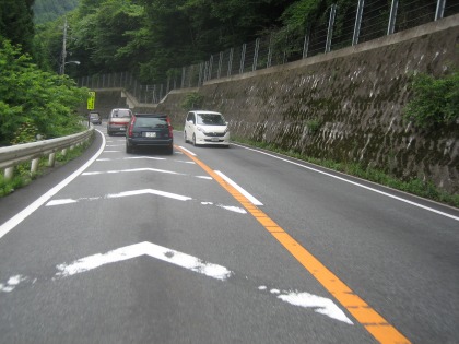 10:11 国道358号線 精進湖からは国道358号線を北上し、甲府方面に進みます。 富士五湖から甲府盆地に下りるのは、河口湖から御坂峠の下部を抜ける国道137号線”御坂みち”を使うのがポピュラーなルートですが、ここ国道358号線を(たぶん)通ったことがなかったので、今回走って見ることにしました。 精進湖からの国道358号線は片側1車線の道路です。 標高約900mの精進湖から約300mの甲府盆地まで一気に下ることもあり、低速コーナーと急勾配の山坂道が連続します。 休日のためか交通量が比較的多く、追い越しができないため、写真の様に四輪車の後ろに着いて走ることとなり、オートバイで走るに快適な路線ではありませんでした。 一方、国道137号御坂みちは、カーブも緩く、幅員も広いため、走りやすい道ですが、スピードが出過ぎるのには注意が必要です。(まれに捕まります(笑)) |