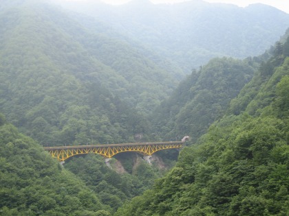 12:52 奥秩父トンネル 奥秩父トンネルを抜け、豆焼橋の上から振り返ると、さっき通ってきた雁坂大橋と雁坂トンネルの入口が見えます。 雁坂大橋がこの角度で見えるので、奥秩父トンネルの中でいかにカーブしているかが想像できます。 しかし、カメラのレンズが曇っているような、実に冴えない天候です。 |